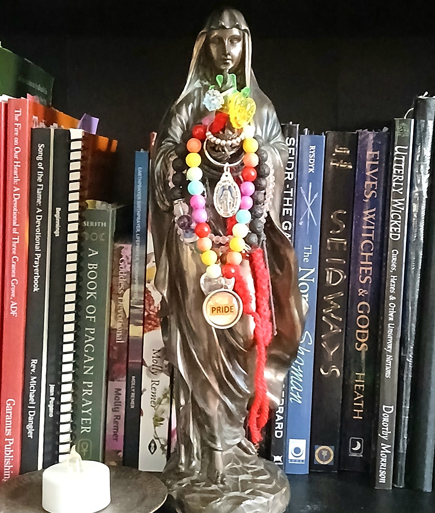 With Vesta’s permission, I switched statues on my desk. Normally Vesta sits on my desk, decked out in pride bracelets, fidget rings, my first crochet chain, a Kuan Yin pendant, a Mother Mary keychain, a locket with my kids’ picture, and little gifts from my kids. Now Vesta’s sitting on the bookshelf next to my side of the bed.